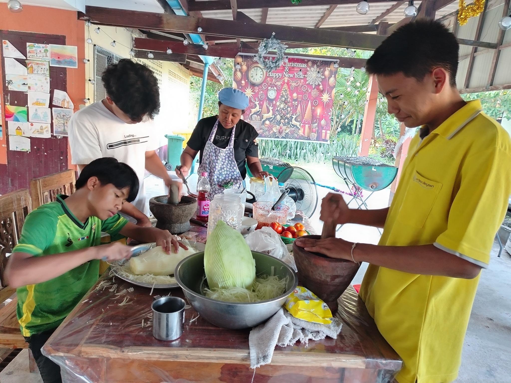 บรรยากาศอบอุ่นในมื้อเย็น เด็ก ๆ และครูช่วยกันเตรียมอาหารส้มตำปลาเผา รับประทานร่วมกัน เป็นช่วงเวลาของครอบครัวเล็ก ๆ ในโครงการ
