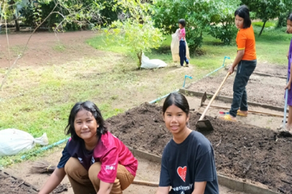เด็กหญิงจากโครงการเยาวชนหญิงสู่ชีวิตใหม่ ศูนย์กาญจนบุรี ลงมือเตรียมแปลงปลูกผักสลัดกับครูหญิง