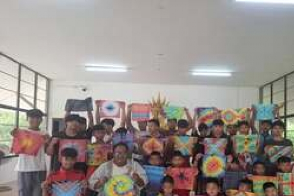 During the school break, Khun Rat, who owns a tie-dye fabric shop kindly came to teach the youth at the New Life Project in Chumphon Province how to create tie-dyed items such as handkerchiefs and shirts, based