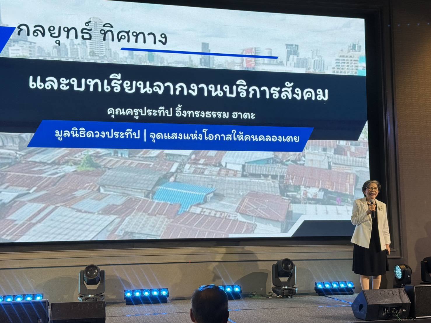ครูประทีป อึ้งทรงธรรม ฮาตะ ผู้ก่อตั้งและเลขาธิการมูลนิธิดวงประทีป ได้รับเกียรติขึ้นกล่าวเสวนาในหัวข้อ “กลยุทธ์ ทิศทาง และบทเรียนที่ได้รับจากงานบริการสังคม” ณ โรงแรมแบงค็อก แมริออท มาร์คีส์ ควีนส์ปาร์ค โดยได้แบ่งปันแนวคิดและประสบการณ์อันทรงคุณค่าจากการทำงานเพื่อพัฒนาคุณภาพชีวิตของผู้คนในชุมชนแออัดมายาวนานกว่า 40 ปี ถ่ายทอดมุมมองเกี่ยวกับการสร้างความยั่งยืนในงานพัฒนาสังคม การทำงานร่วมกับภาคีเครือข่าย และการเสริมพลังคนในชุมชนให้สามารถพึ่งพาตนเองได้อย่างมั่นคง ทั้งนี้การเสวนาครั้งดังกล่าวเป็นอีกหนึ่งเวทีสำคัญที่เปิดโอกาสให้ผู้ร่วมงานได้เรียนรู้จากประสบการณ์จริงของนักพัฒนาสังคมผู้มุ่งมั่นและทุ่มเทตลอดชีวิตเพื่อสังคมไทย